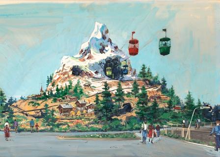 This concept art depicts the former Skyway passing through the Matterhorn. You can see the mountain high above an Alpine village and a surrounding forest.